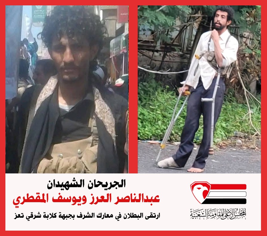 أكّد مجلس المقاومة الشعبية بمحافظة تعز أن التضحيات التي قدّمها المقاتلان عبدالناصر العرز ويوسف المقطري، اللذان ارتقيا شهيدين في معارك الشرف بجبهة كلابة شرق المدينة، تمثّل رسالة صمود وعزّة تتجاوز الإعاقة والجراح، وتؤكد ثبات أبناء تعز في مواجهة ميليشيا الحوثي الانقلابية.