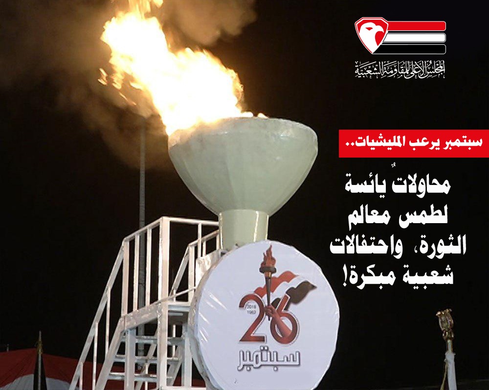 تسعى المليشيات جاهدَةً إلى طمس معالم سبتمبر ومحوها من الذاكرة اليمنية، في الوقت الذي يتمسك فيه أبناء الشعب بهذه الثورة المباركة وذلك التاريخ العظيم الذي سجّل أعظم انتصارٍ في تاريخ اليمن.