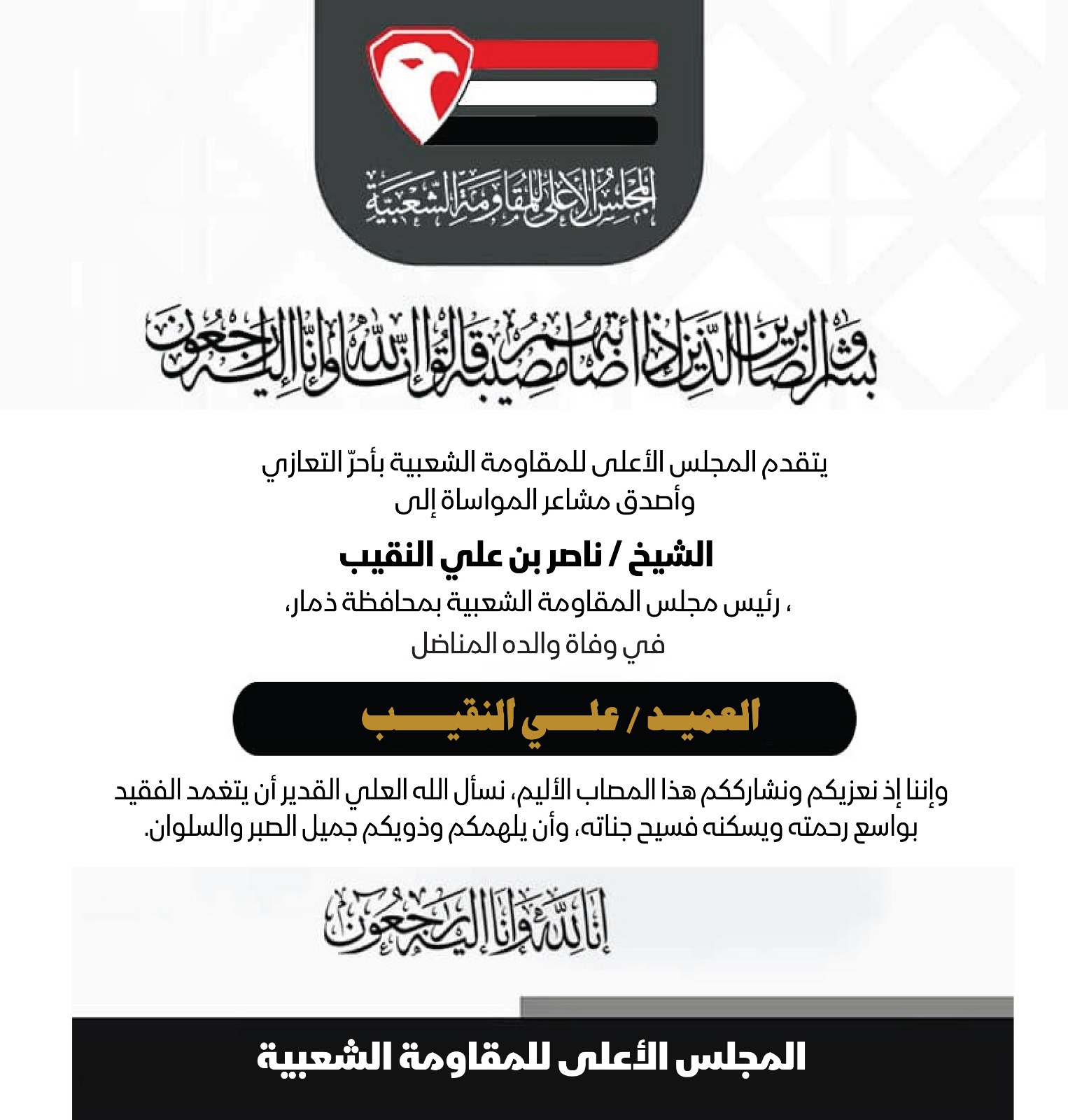 يتقدم المجلس الأعلى للمقاومة الشعبية بأحرّ التعازي وأصدق مشاعر المواساة إلى الشيخ / ناصر بن علي النقيب، رئيس مجلس المقاومة الشعبية بمحافظة ذمار، في وفاة والده المناضل العميد علي النقيب.